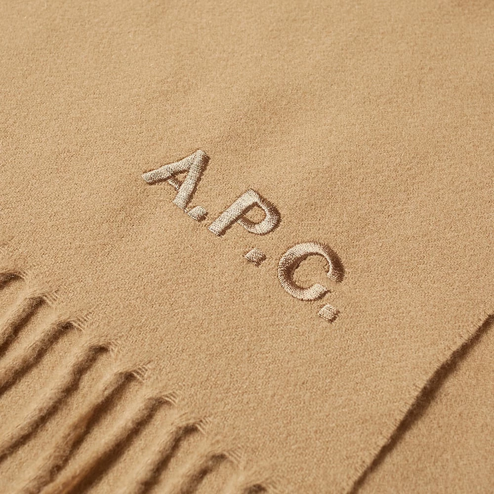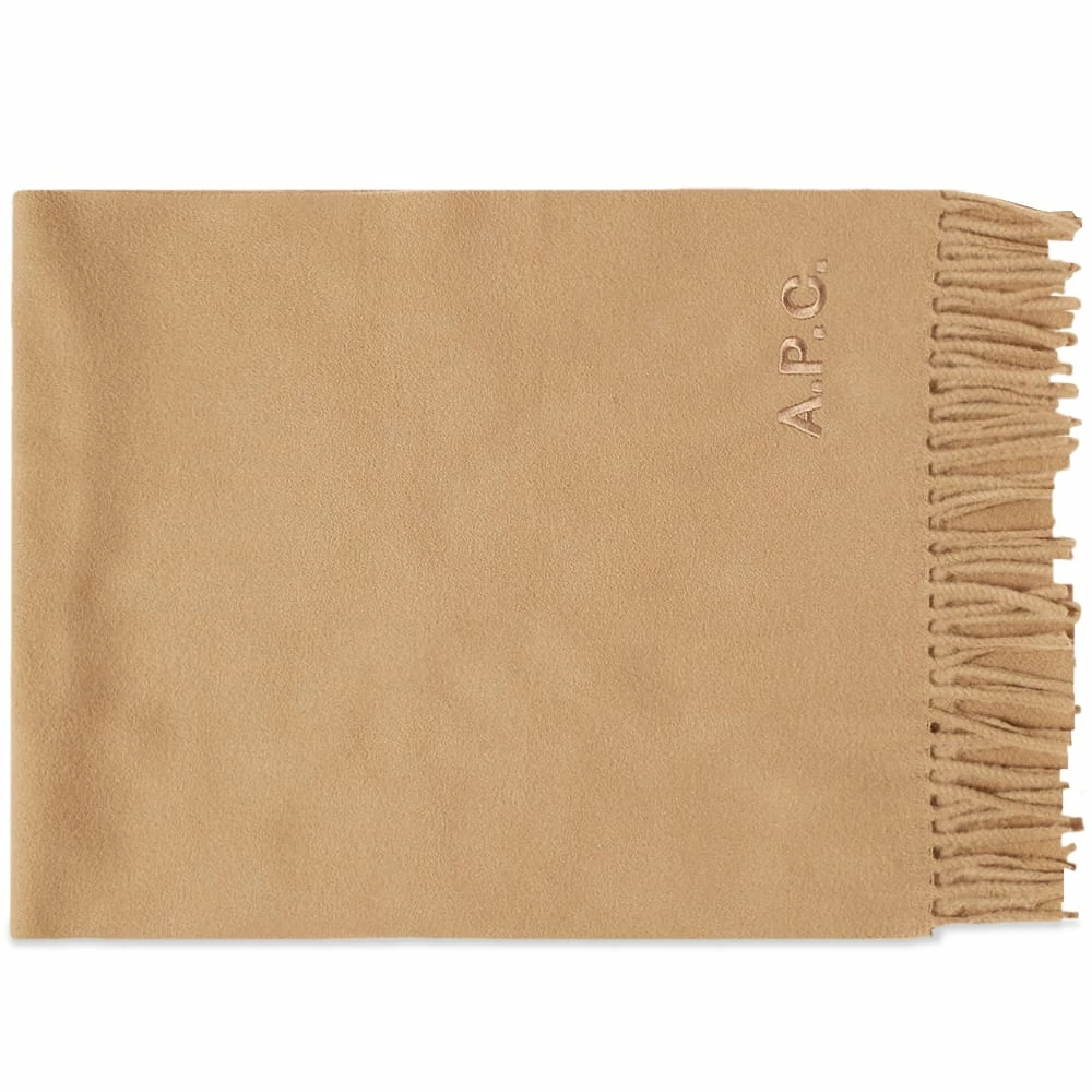 Keep your accessory collection refined with this sleek scarf from Parisian label A.P.C.. Perfect for draping over trenches, this camel-coloured scarf is made from pure wool and embroidered subtly with the brand’s name at the fringed edge.