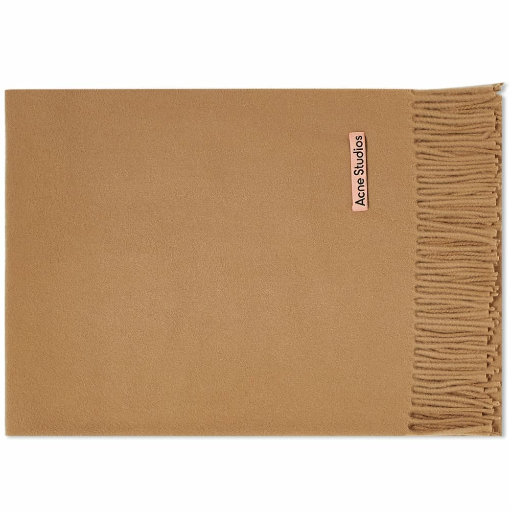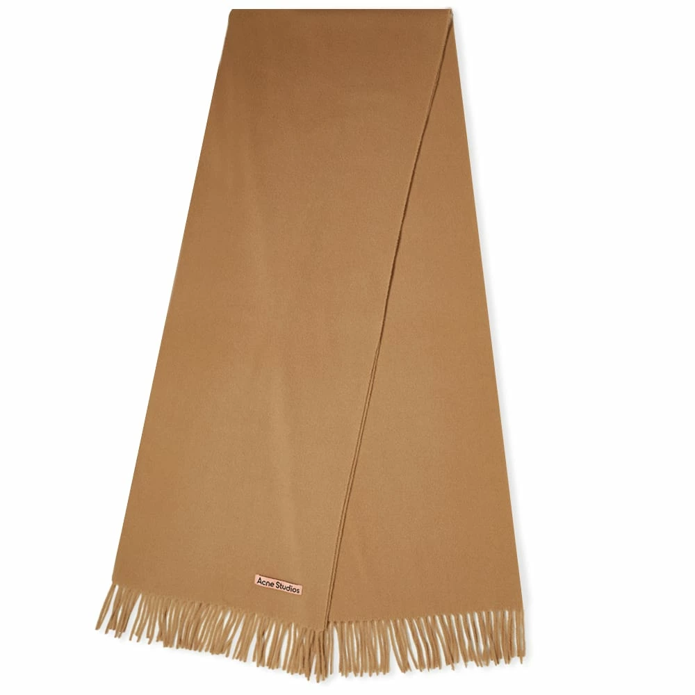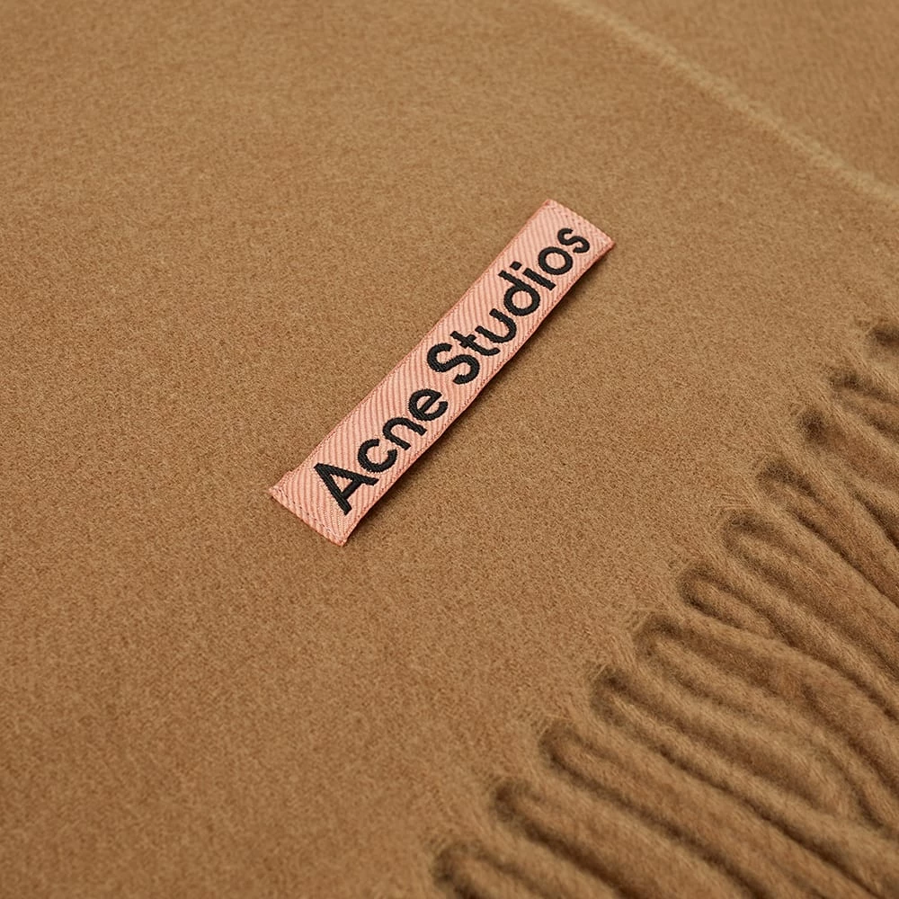 Stay casually comfortable in this classic camel scarf from Acne Studios. It’s finished with fringe-like tassels and a small pink brand tab.