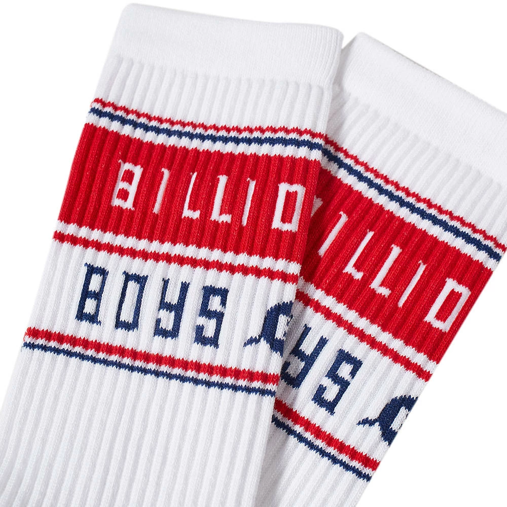 The brainchild of singer Pharrell Williams and Japanese designer Nigo, experimental streetwear brand Billionaire Boys Club was first launched in 2003. Crafted from a cotton blend, these white socks feature a red and blue colour block. Finished with contrasting embroidered branding.