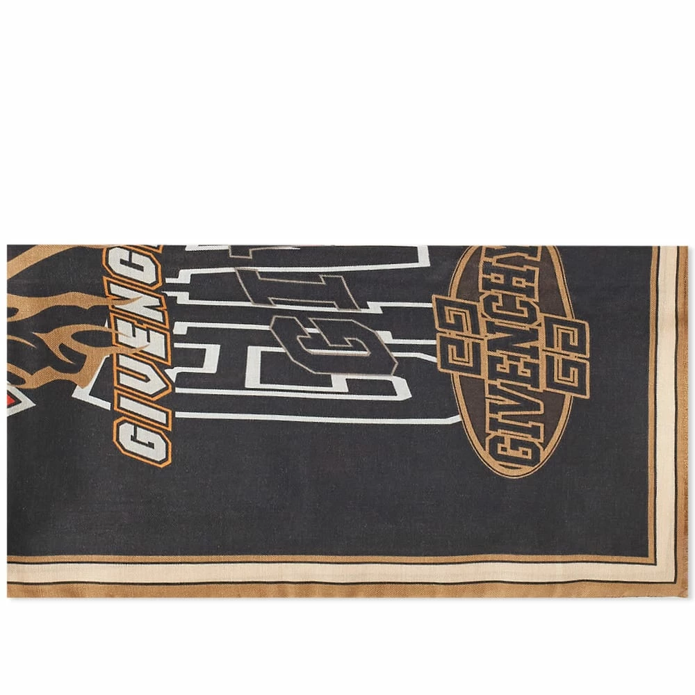 Givenchy celebrates colour and print with its Multi Logo Scarf. The French fashion house delves deeper into its iconic lettering logo alongside the Givenchy slogan in an artistic realm with a flame outline finishing the accessory.
