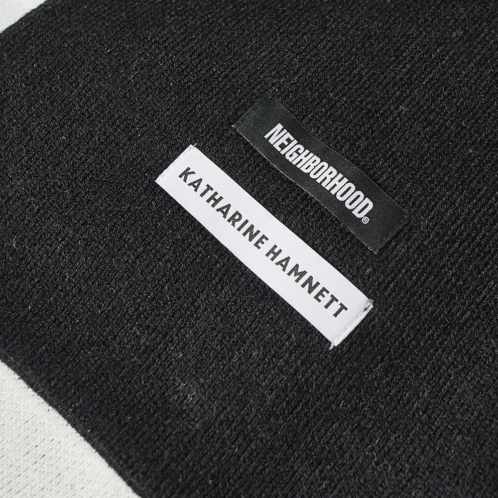 Japanese streetwear brand Neighborhood links up with British designer Katherine Hamnett – best known for her political slogans – to create an autumn winter collection. Signature block lettered and bold branding is woven throughout at both sides and a co-branded patch is at the hem with a “choose life” slogan in worldwide languages.