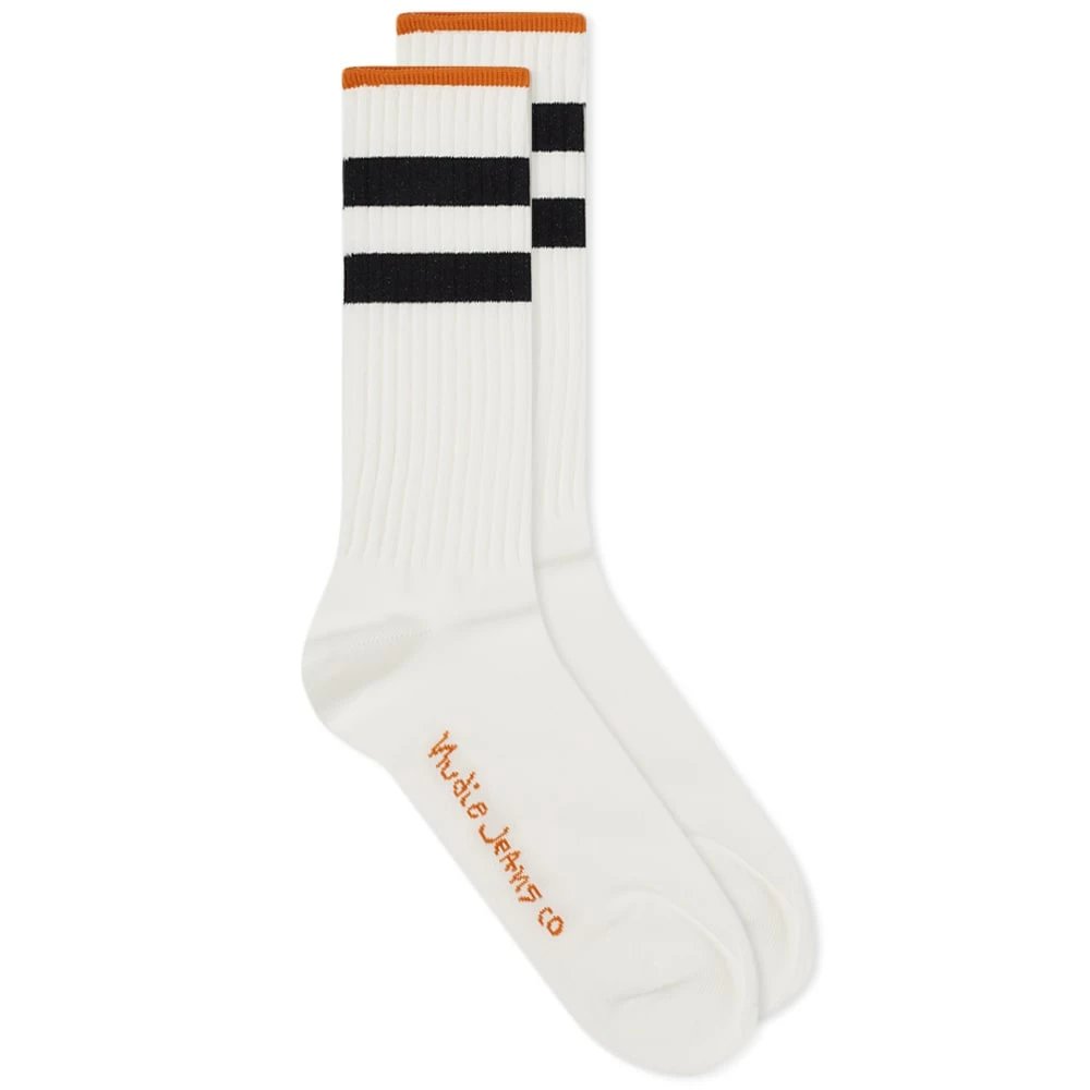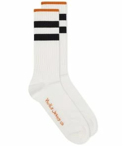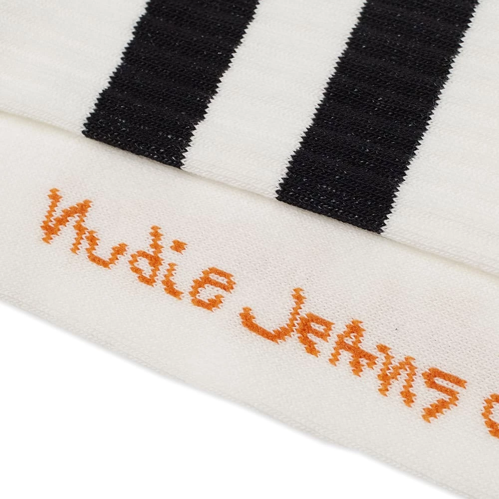 These soft, white socks from Nudie are sustainably made from an organic cotton blend, complete with sporty-inspired stripes and the brand’s signature logo.
