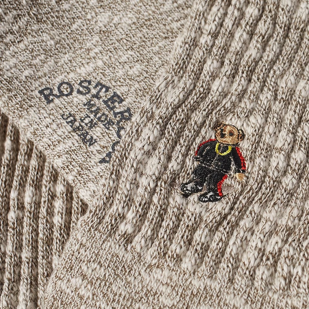 Rostersoxs’ socks are handcrafted in Japan with a strong focus on comfort, woven from a soft cotton blend with comfy ribbed cuffs. Coveted for their playfulness, this khaki pair features a sporty dressed bear embroidered at the ankle.