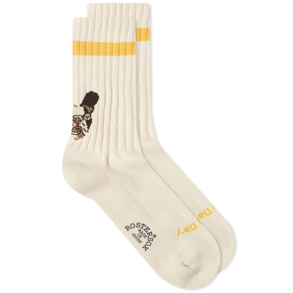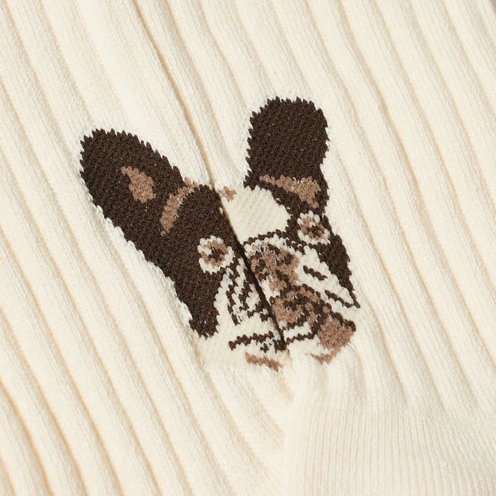 Rostersox is a coveted Japanese sock maker, famed for its attention to detail and use of pop colours. Guaranteeing to add a positive vibe to any outfit, this white pair features a bright sporty stripe at the cuffs, along with an adorable Frenchie motif at the ankle.