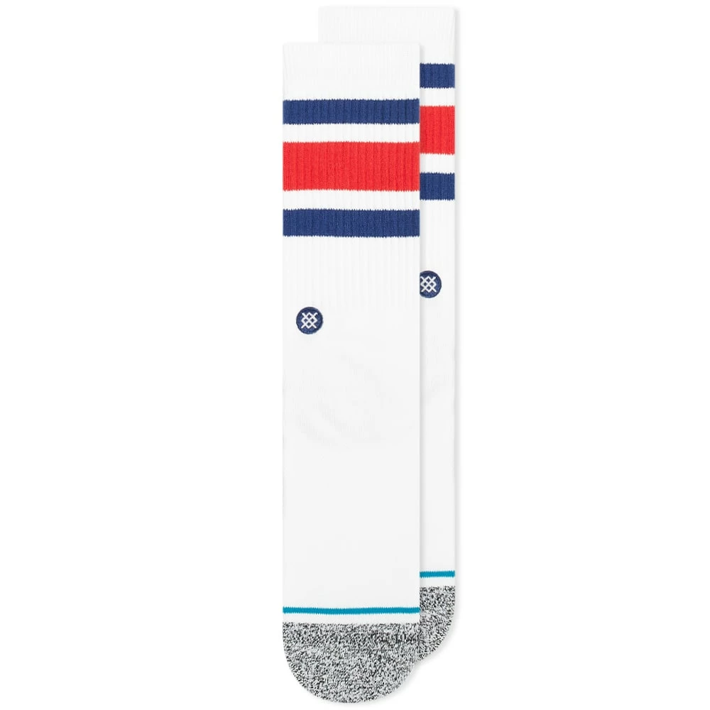 Comfort is at the core of everything that Stance does, that’s why these white Boyd socks are fitted with ergonomic arch support and reinforced at the toe and heel. Branded with an embroidered logo, they’re completed with red and blue stripes around the ankle.